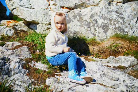 Adorable toddler girl on hiking path through cliffs on Crozon Peninsula, one of the most popular tourist attractions in Brittany, France