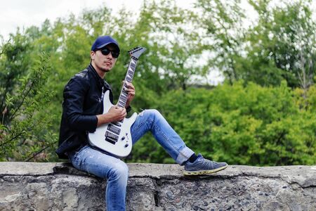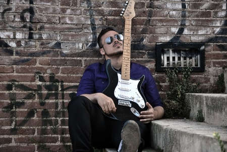 A young guy with a guitar , wearing a leather jacket and sunglasses, toned