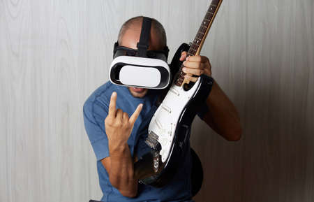 a man with a guitar emotions music game performance leather jacket sunglasses light background
