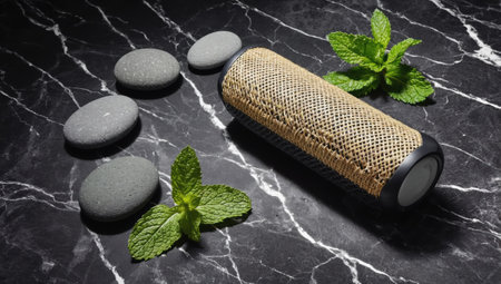 Portable bluetooth speaker with jute fabric and zen stones on marble surface