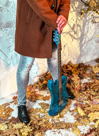 Unrecognizable male person with electric guitar. Close up, part body guy is holding instrument and playing. Hobby, music concept