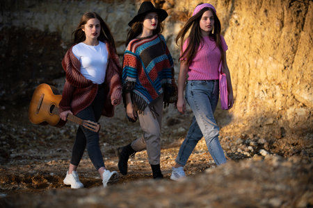 Group of trendy girls having fun outdoors. Stylish teenage girls friends on vacation. Pretty girlfriends. Girls enjoying travel. Fashionable teens. Three girls in hippie style. Gen Z friends.