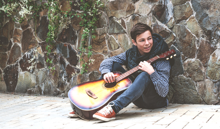 Dehradun, Uttarakhand/India-September 12 2020:A youngster playing guitar in beautiful hills.