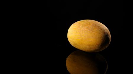 Half of Hami melon fruit on black stone background surface with free space. Background is blurry, the main focus on melon