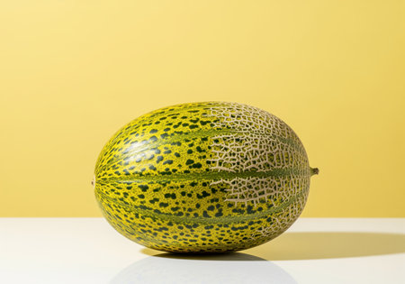Piel de sapo melon, characterized by its speckled green and yellow skin, resting on a reflective white surface against a vibrant yellow backdrop. studio shot emphasizing freshness and texture.