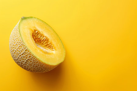 Ripe Galia Melon Half Seeds Exposed, Vivid Yellow Green, Isolated on Vibrant Yellow Background