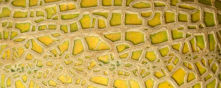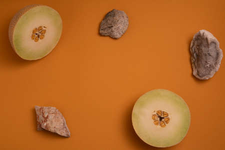 Exotic cantaloupe melon and slices on marigold coloured backdrop. Ripe tropical fruit background. Idea of spring summer season colour trend. Food photography. Flat lay, copy space.