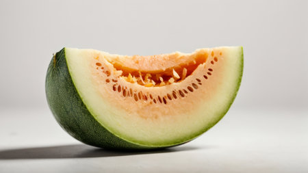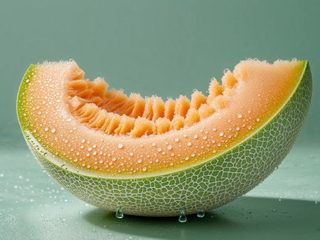 Brightly colored cantaloupe slice reveals juicy, sweet flesh with a smooth surface against a soft pastel backdrop, ideal for summer dishes and refreshing snacks
