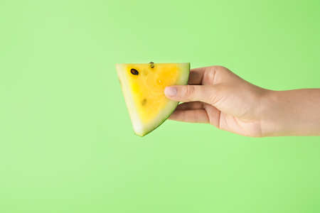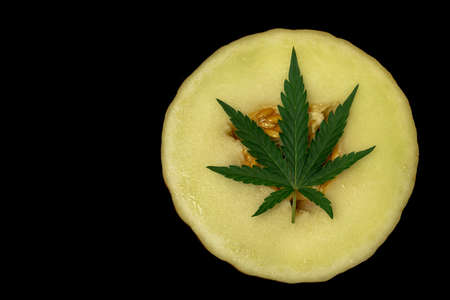 Yellow water melon with fresh dark green leaf of marijuana flower