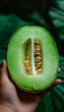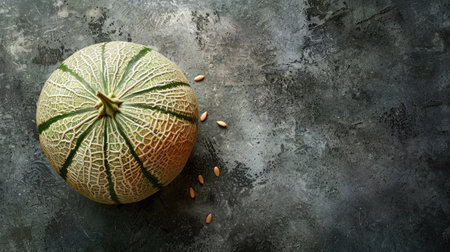 A detailed view of a ripe cantaloupe melon, showcasing its textured rind and juicy orange flesh with seeds. A perfect representation of freshness, nutrition, and the joys of summer fruit.