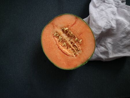 Photography of a cut in half Charentais melon isolated on slate for food illustrations