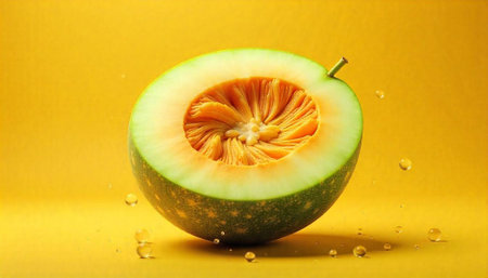 Freshly Halved Cantaloupe Melon Isolated on Vibrant Yellow, Summer Fruit, Ripe and Juicy