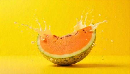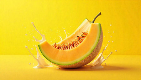 A juicy slice of ripe cantaloupe stands upright against a vibrant orange and yellow background, showcasing its fresh color and texture.