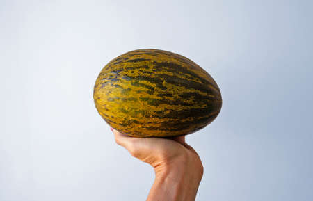 Hand holding honeydew melon with blurred background, providing ample space for text placement
