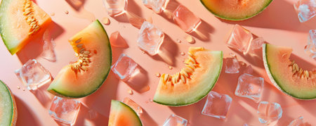 A refreshing summer-themed background showing slices of melons, including cantaloupe, honeydew, and watermelon, combined with ice cubes on a coral pink surface. The cool and juicy fruits create a refreshing atmosphere.