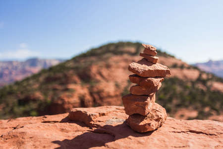 A carefully balanced stack of zen stones stands as a symbol of stability and mindfulness on a rocky cliff.