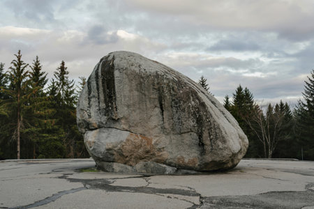 Imposing Boulder Blocks Misty Mountain Road A Symbol of Nature s Power and Isolation.