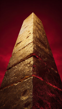 Dramatic Gold Bar Tower Against Red Flag with Upward Lighting