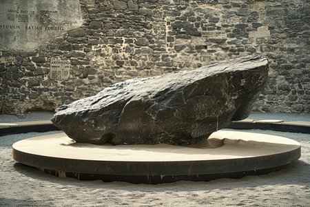 Illustration of large stone slab sits in the center, surrounded by circular seating areas where people can sit and gaze upon it, with an earthy background, symbolizing new hope or freedom at hailala national park's main square. the rock is black chalcedony with a rough texture.