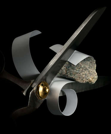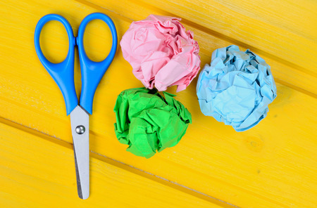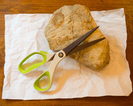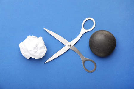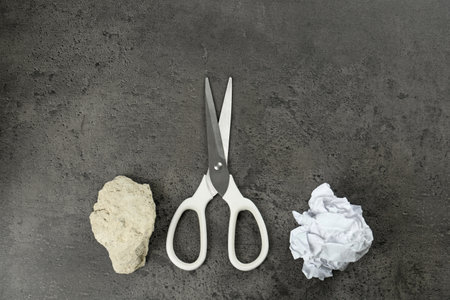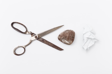 high-angle shot of a rock, a crumpled paper and an old pair of scissors, depicting the rock-paper-scissors game, on a rustic wooden surface