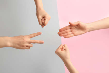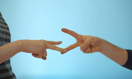 Close up hands of young couple playing rock paper scissors on blue background indoors.