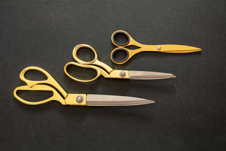 Scissors gold color set on black background, Tailor, barber, hairdresser luxury equipment, top view
