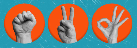art collage. Three open hands with an image of a fist, number two, and an ok sign. Black and white hands on blue background.
