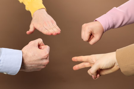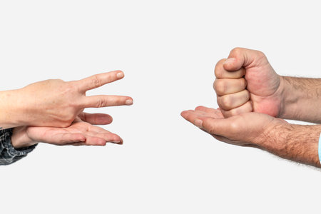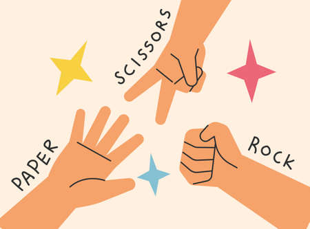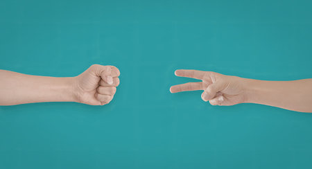 Two hand playing rock paper scissors; one hand showing scissors sign and another hand showing paper sign.