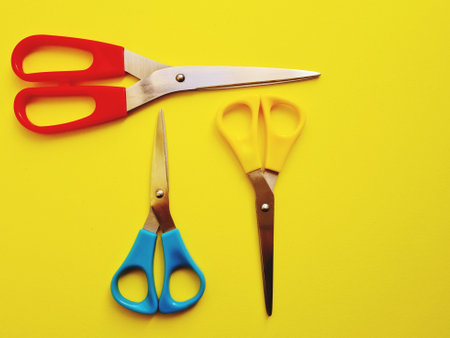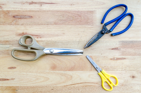 Scissors for children and adults for different purposes on a gray background. Scissors for seamstress, hair cutting and for children's creativity.