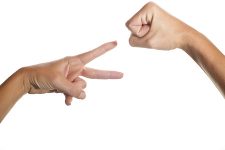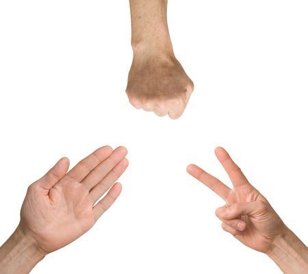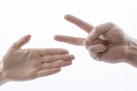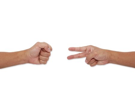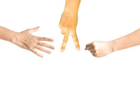 Closeup of hands making: Rock, paper, scissors isolated on white