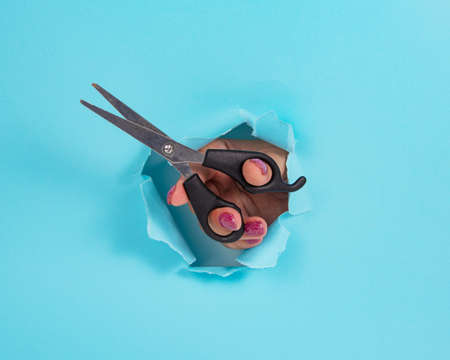 Abstract woman hand gesture of victory or v sign finger combination in blue torn page background with copy space