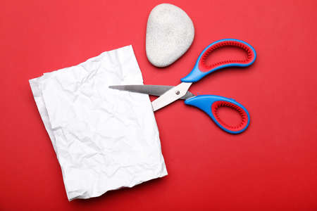 Rock, paper, scissors is the best choice way to decision making. Top above view flat lay, concept pattern falling on white background.