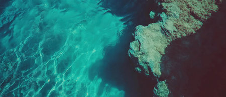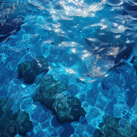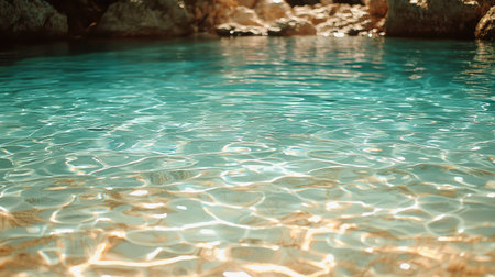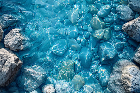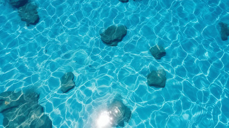 Top view of clear blue water, with crystal rocks on the bottom, sunlight reflection creating a summer vibe. The image has a clean, sharp focus with minimal contrast, showcasing the natural beauty of the scene in neutral colors. --chaos 30 --ar 16:9 --quality 2 --stylize 500 --v 6.1 Job ID: 306d4d90-dbbe-4b71-bfeb-f10b935d6f69