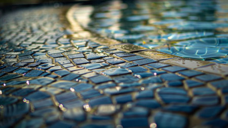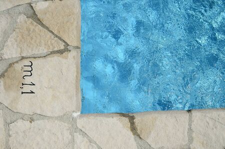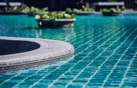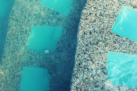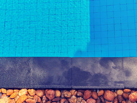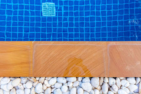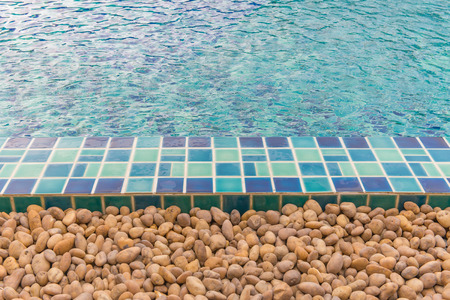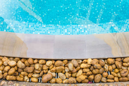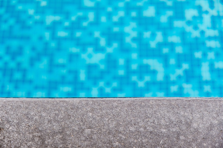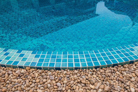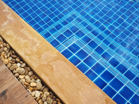 Edge of swimming pool with blue mosaic tiles at the bottom of the pool. poolside.