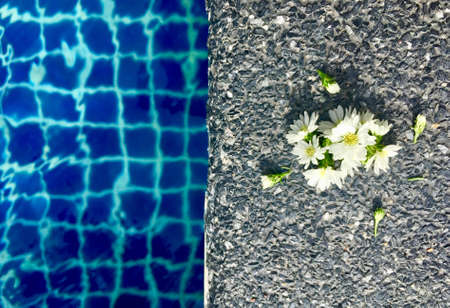 Bloom White aster flowers with bud put on stone floor near swimming pool in summertime