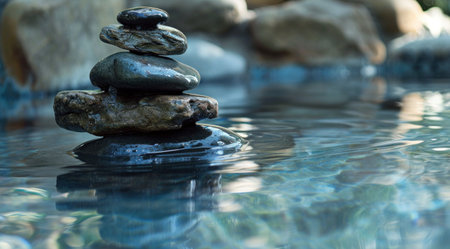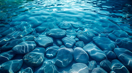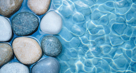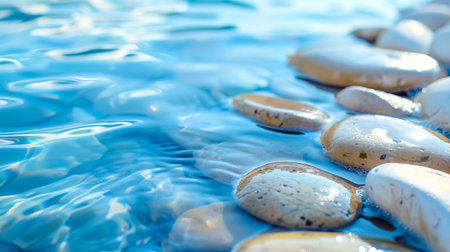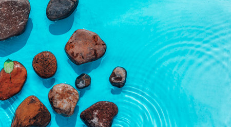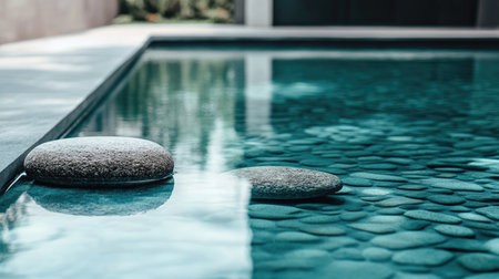 Experience a moment of serenity with smooth stones resting peacefully in a clear blue pool, creating a tranquil ambiance for relaxation and meditation.