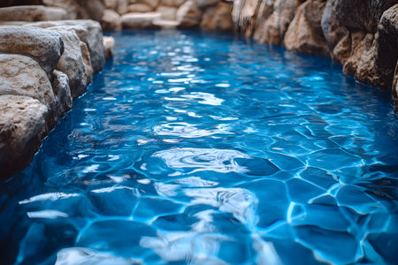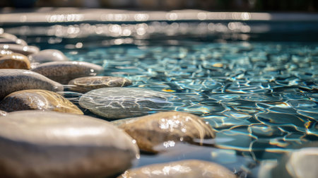 Clear blue water gently ripples around smooth stones at the edge of a swimming pool under bright sunlight, creating a peaceful atmosphere. The sun reflects off the water, enhancing tranquility.