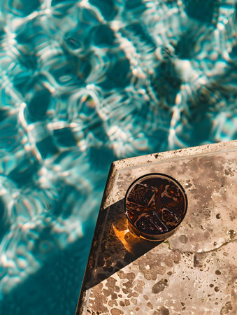 Top view of a dark brown drink by the poolside. Luxury Vacation Wallpapers