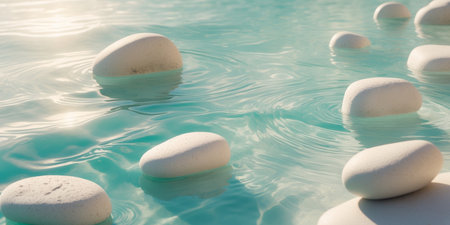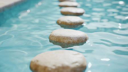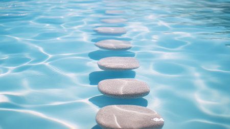 Stepping stones floating on a turquoise water surface, creating a relaxing and peaceful atmosphere