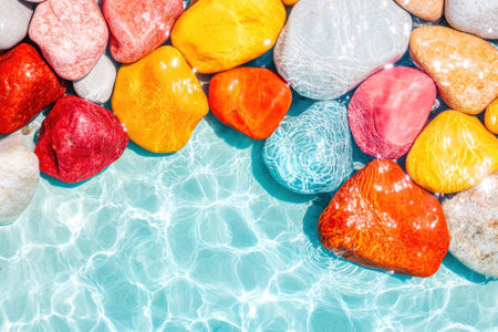 Vibrant pebbles in various hues rest beneath clear water sunlight creates mesmerizing reflections and patterns. This overhead composition captures the serene beauty of natures artwork.