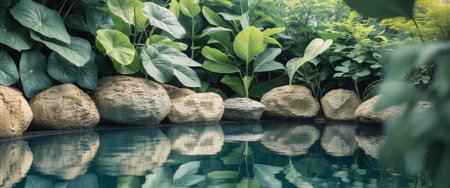 AI Generated. Tranquil poolside scene featuring textured stones and lush greenery reflecting in water
