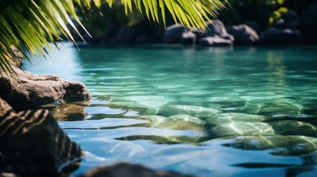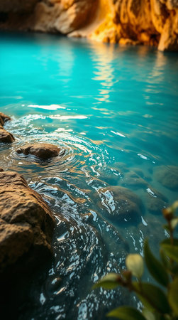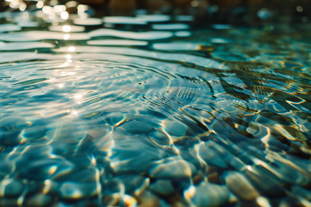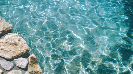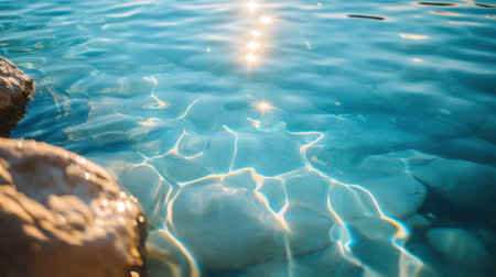 This image captures the serene beauty of crystal clear water gently reflecting sunlight, accompanied by natural stones at the edge, creating a tranquil outdoor scene.