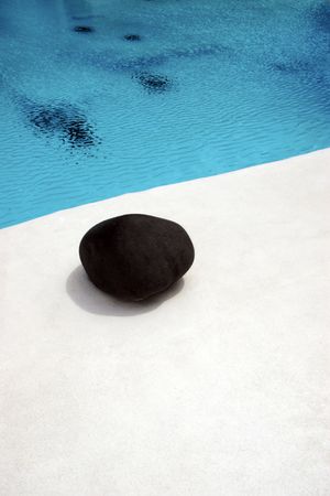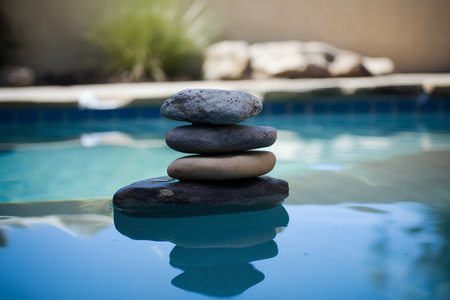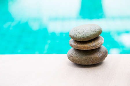 Zen stone on swimming pool edge over blurred blue water background, outdoor day light, stone stack over blurred background