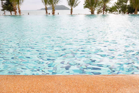Horizontal shot with copy space of beautiful swimming pool with sea view and blue clear water ripples shows vacation destination for summer holiday under sunlight, beach and water reflection.