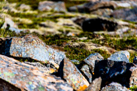 Rock Ptarmigan Bird well camouflaged against the mountains of beautiful Lofoten, Norway. Birdwatching Lofoten Traveling in Norwegian beautiful Landscapes.