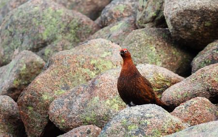 Male red grouse (Lagopus lagopus scotica) perched on rocks in Scottish mountains.