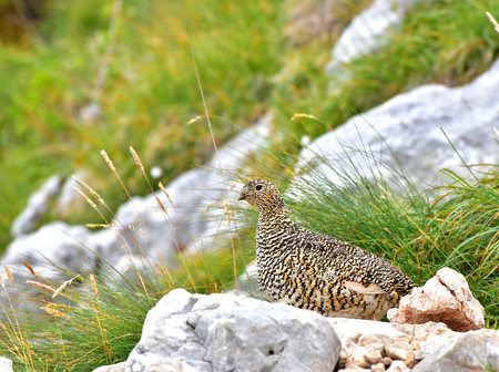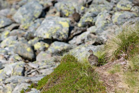 The rock ptarmigan (Lagopus muta japonica) is a medium-sized game bird in the grouse family. This photo was taken in Japan.