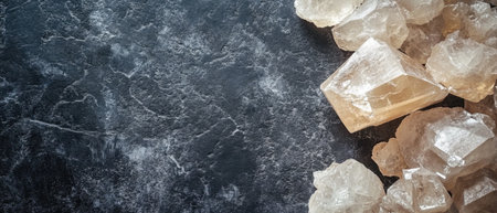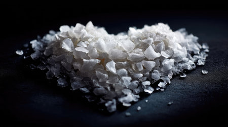 A stunning close-up image of crystalline sea salt scattered on a dark surface, showcasing the natural beauty and texture of the salt with sparkling highlights.