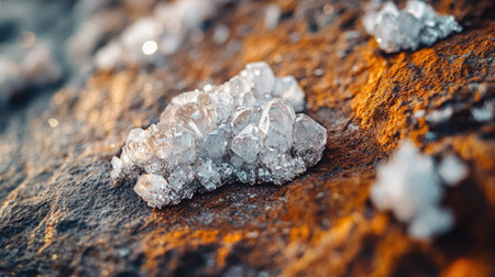 An extreme macro shot capturing rock salt (sodium chloride) granules spread thinly over cold, rough