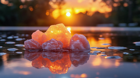 Salt crystals in shades of pink are surrounded by still water, mirroring the vibrant colors of a sunset. The peaceful atmosphere invites relaxation and contemplation.